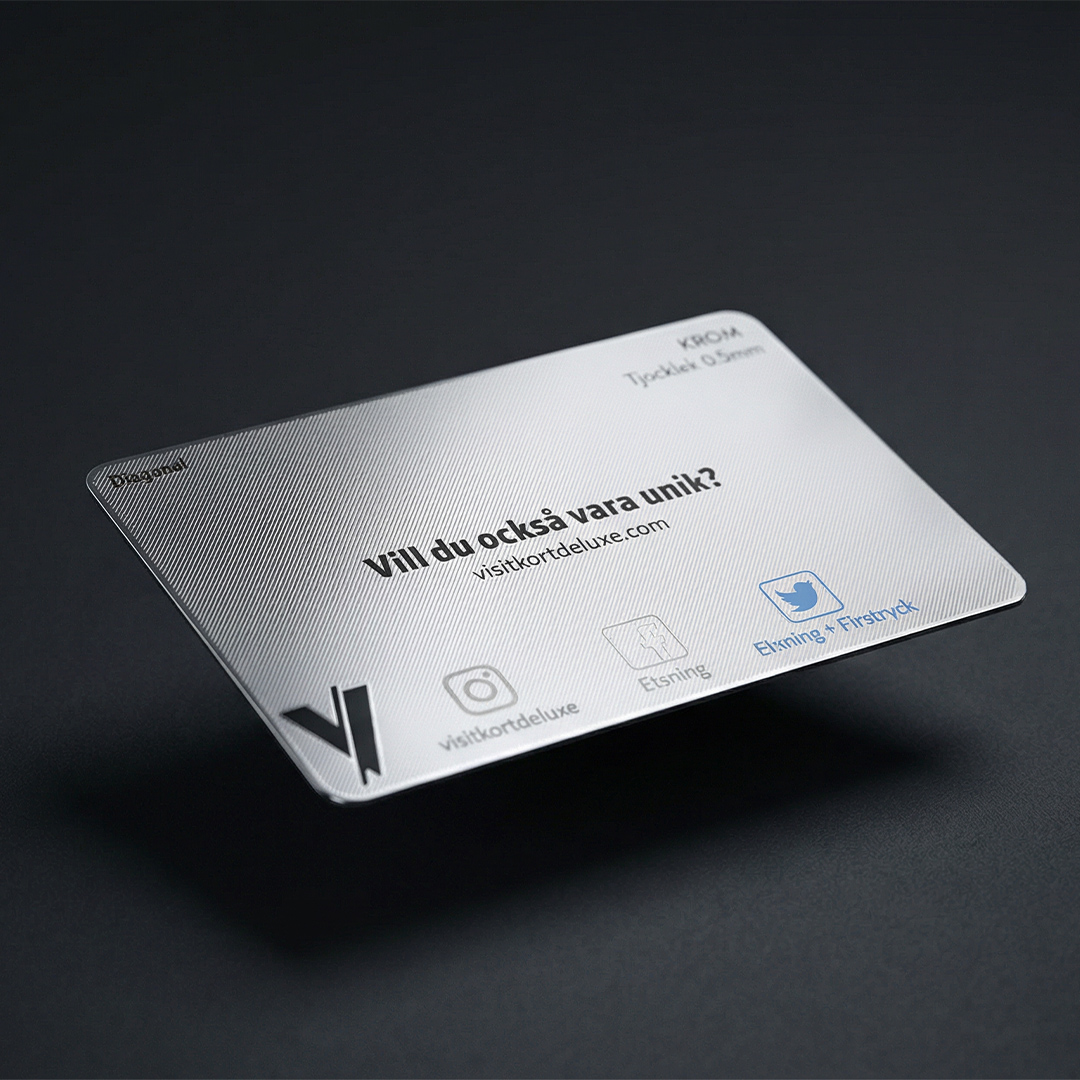 Krompläterade metallkort blir både eleganta och moderna. Tillgängliga i olika utförande, graveras för att nå olika mönster som definitivt gör kortet till en konversationsstartare!